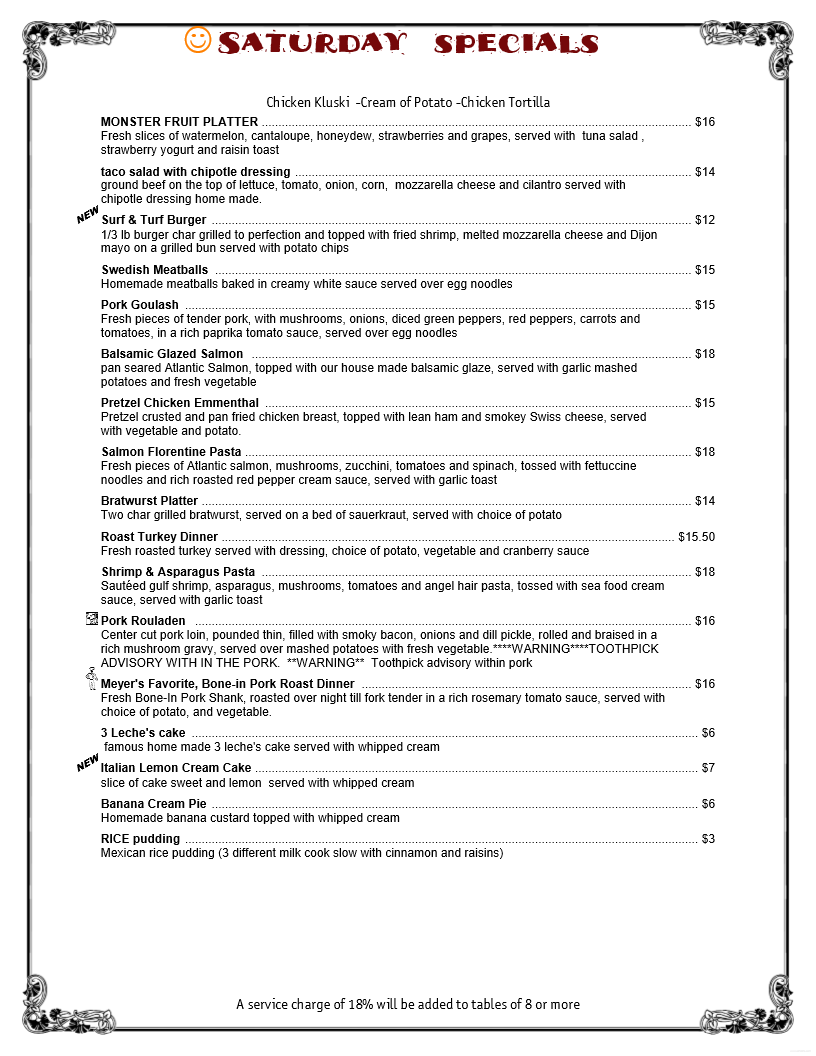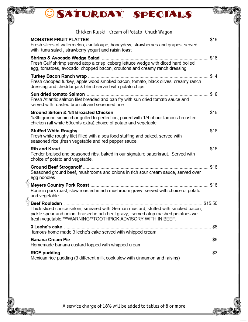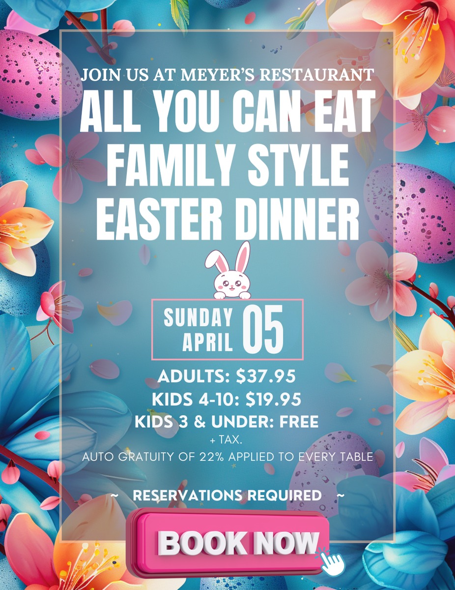 We held a family 80th birthday party here. 18 of us for Broasted, chicken dinner, served family style was fabulous! Helpful, friendly staff. Room to visit and no dishes for me afterwards. We all highly recommend Meyer's now and will return.