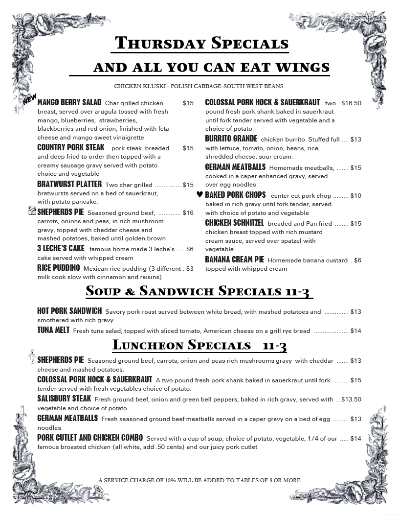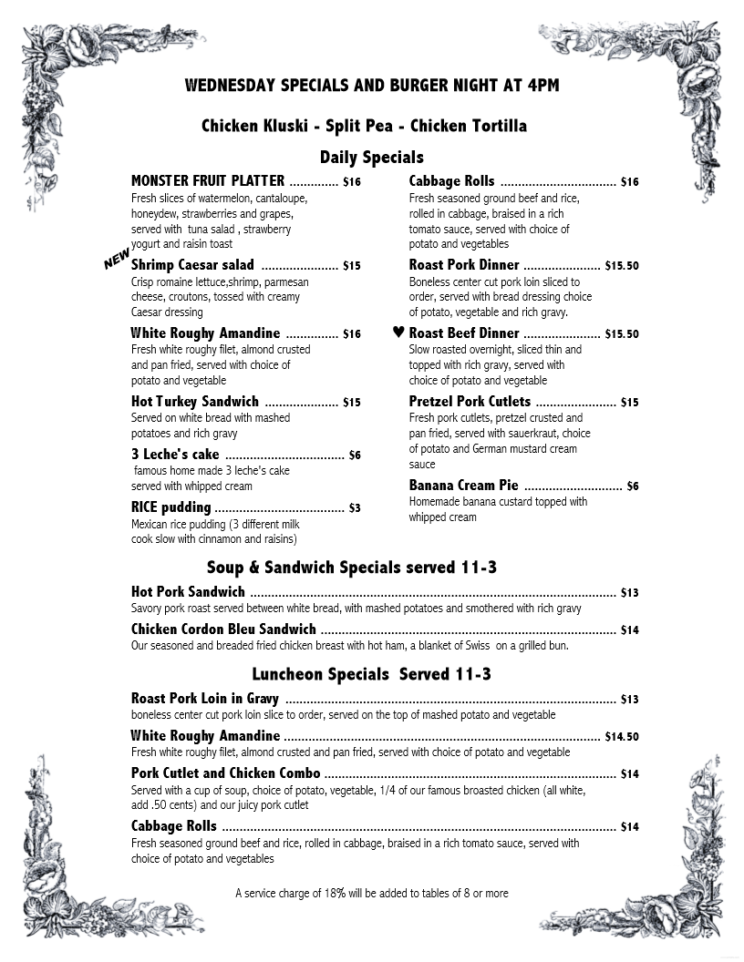 OrderI had the pretzel pork cutlets, which were delicious. It comes with a tasty sage dressing. The mashed potatoes with gravy and green beans completed a very good plate. We also had the garlic bread. It was garlicky, buttery, and so good. A schaum torte with vailla ice cream and strawberries was a great ending to a satisfying meal!
