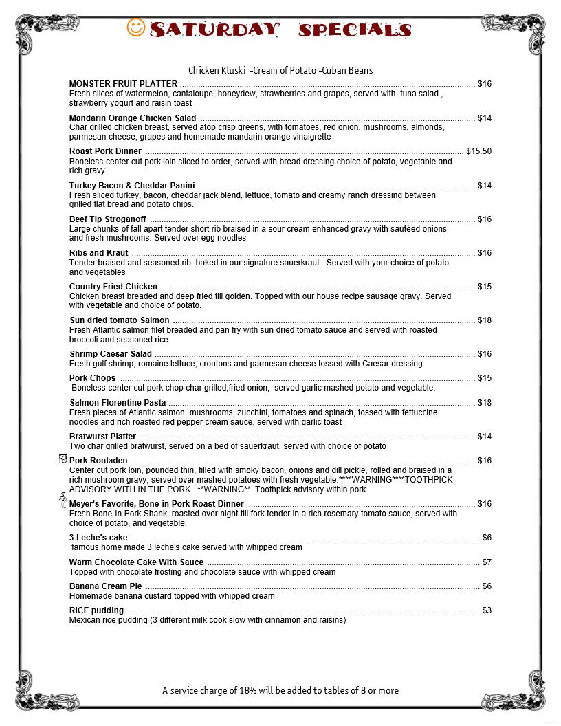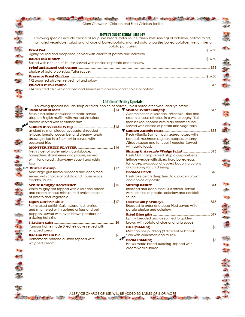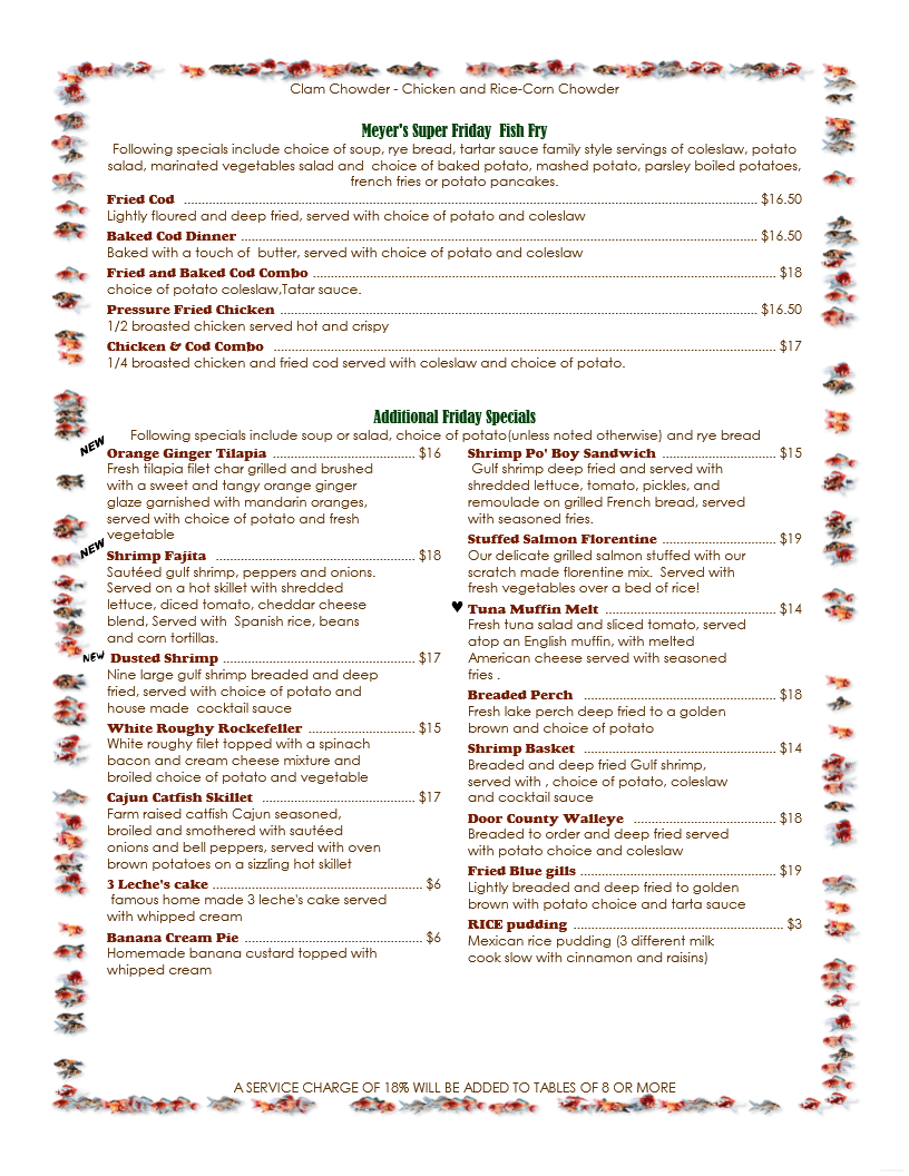 This was my first visit to Meyer's. The staff was very friendly and the food was well prepared and served quickly. I had the breasted chicken and baked cod combo. Very tender and tasty. Restaurant is easy to find and the parking is plentiful.